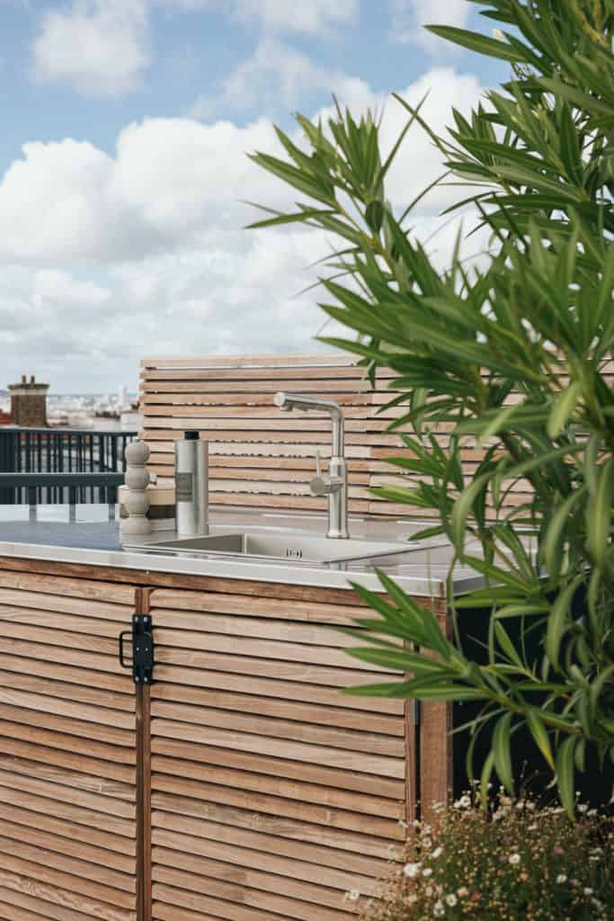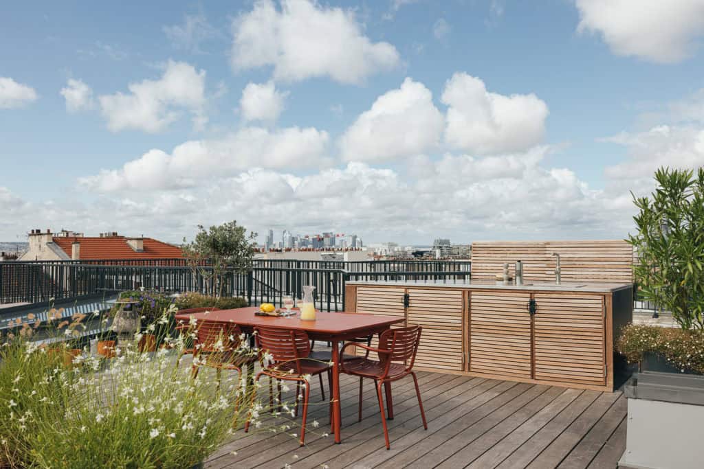 Des pots ronds sur roulettes peuvent à la fois séparer l’espace dinatoire du reste de la terrasse, ou au contraire être déplacés pour libérer davantage de place. La cuisine a été réalisée sur mesure pour accueillir une plancha et un évier et du rangement.