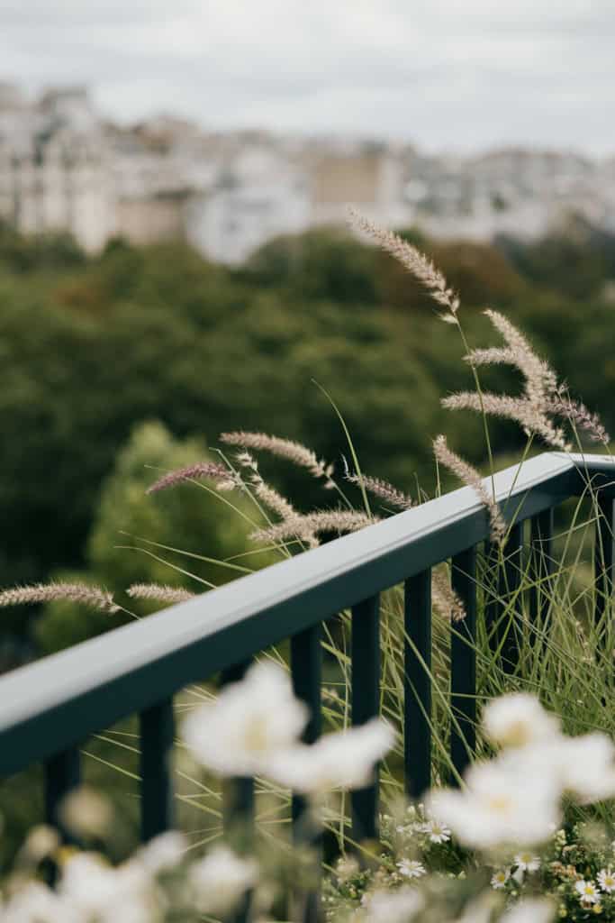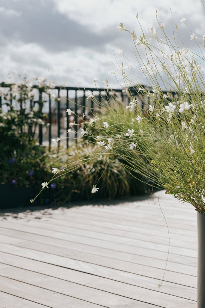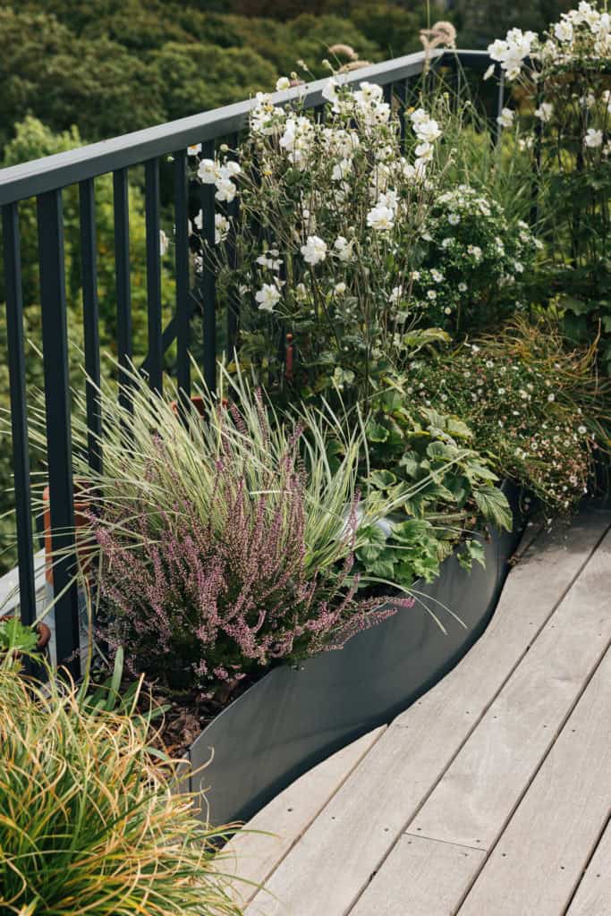 Les plus grands végétaux affleurent délicatement le haut de la rambarde, tout en transparence. Ils forment un grand massif, comme ils le feraient dans un jardin. Ils se succèdent et se renouvellent au fil des saisons pour apporter couleur et variété.